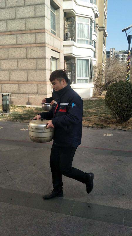 周邊社區送水。物業服務人員通知小區居民接水,還在現場安排了物業保