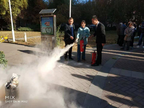 演習開始,由總指揮代經理發出指令,消防中控員發現報警,巡邏保安員立即到達火場確認,并向中控室報告。消防中控員立即通知各組按消防預案展開撲救和疏散等。現場對滅火器的使用方法經行講解,部分底商商戶和業主分別體驗了滅火器使用演練等。