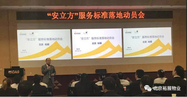 2019年4月18日,北京裕展物業(yè)召開“安立方”服務標準落地動員暨“五好三快一穩(wěn)”服務標準全員培訓會,公司除在崗值 班人員外200多員工參加,培訓由總經(jīng)理黃長良主持宣貫。