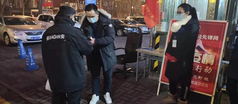 “您好,請出示證件,并配合我們測下體溫!痹缟8時,軟件園南門外、停車場出入口數名安檢人員戴著口罩,拿著溫度測量儀,對進入園區的人員進行溫度檢測。